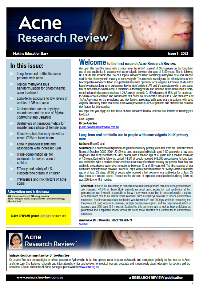 Dr Jo-Ann See. The Review covers topics such as acne vulgaris, acne scars, antibiotic use, photodynamic treatment and assessment of other available treatments.