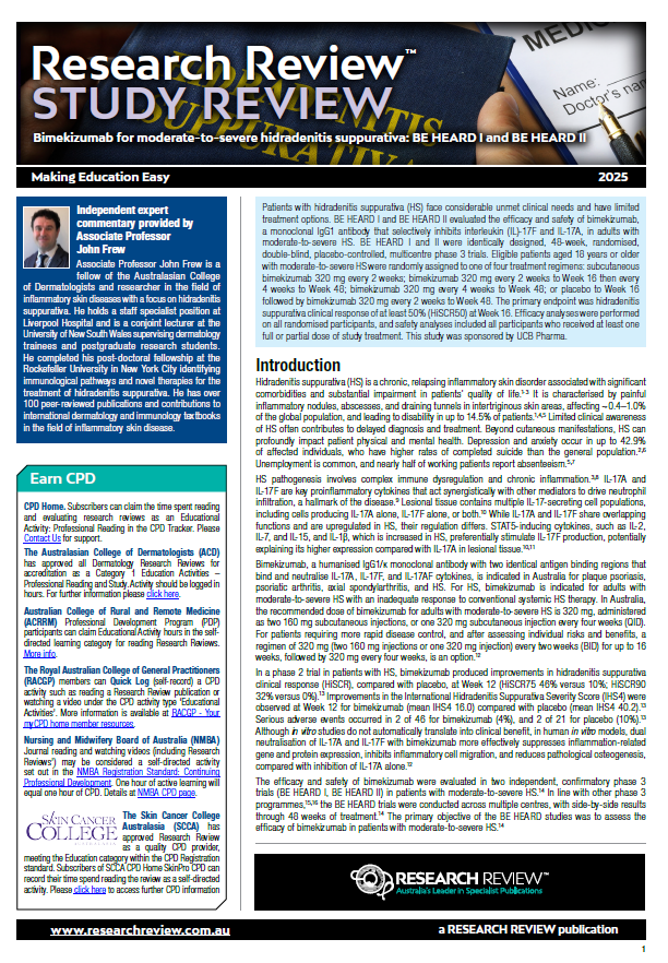 Independent commentary for the review has been provided by Associate Professor John Frew, a fellow of the Australasian College of Dermatologists and researcher in the field of inflammatory skin diseases with a focus on hidradenitis suppurativa. He holds a staff specialist position at Liverpool Hospital and is a conjoint lecturer at the University of New South Wales.