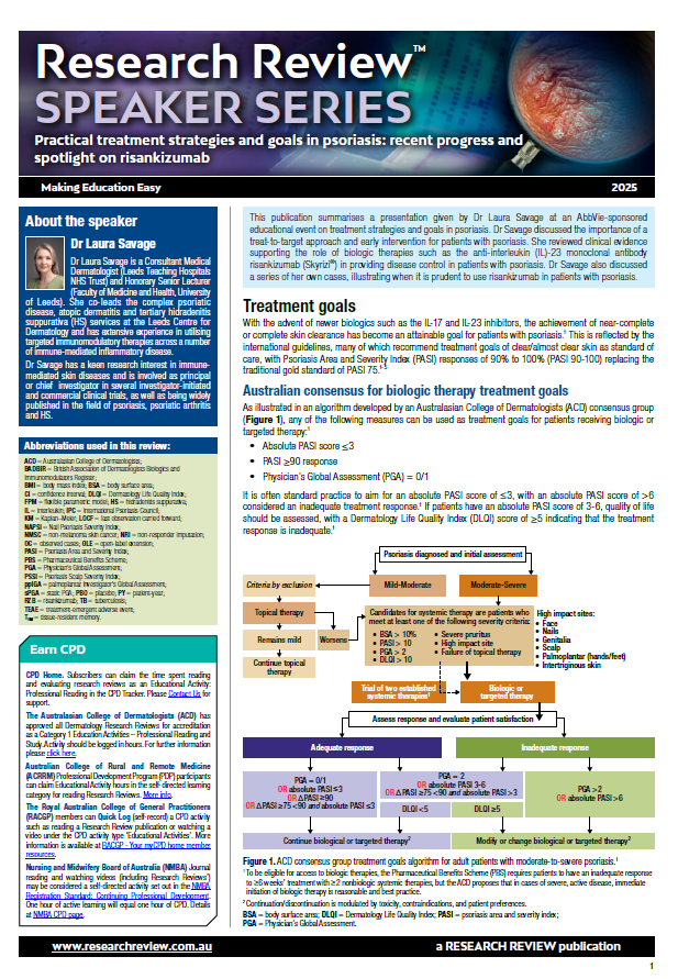 This review summarises a presentation given by Dr Laura Savage at a sponsored educational event on treatment strategies and goals in psoriasis. Dr Savage discussed the importance of a treat-to-target approach and early intervention for patients with psoriasis. Dr Savage is a Consultant Medical Dermatologist (Leeds Teaching Hospitals NHS Trust) and Honorary Senior Lecturer (Faculty of Medicine and Health, University of Leeds).
