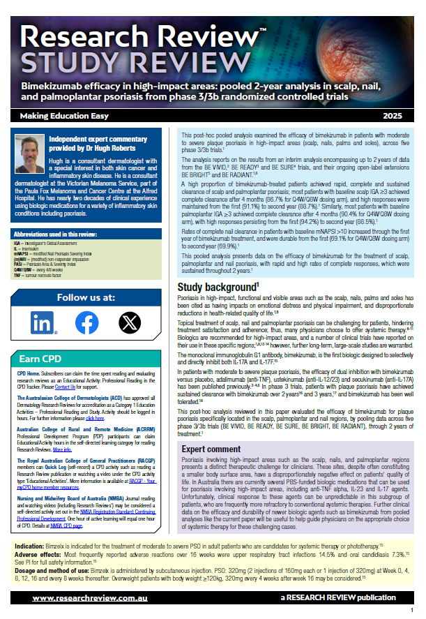 As part of our ongoing aim to bring you reports of new developments, we have added a review which examined the efficacy of bimekizumab in patients with moderate to severe plaque psoriasis in high-impact areas (scalp, nails, palms and soles), across five phase 3/3b trials. The analysis reports on the results from an interim analysis encompassing up to 2 years of data from the BE VIVID, BE READY and BE SURE trials, and their ongoing open-label extensions BE BRIGHT and BE RADIANT.