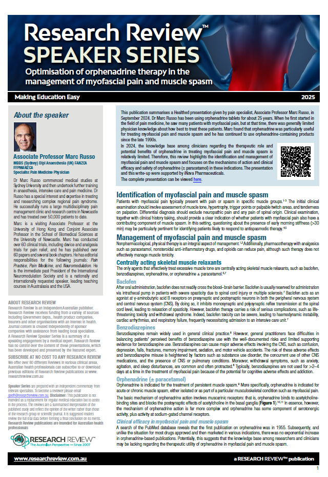 The publication summarises an online presentation given by pain specialist, Associate Professor Marc Russo, who has been using orphenadrine for over 25 years for treating myofascial pain and muscle spasm. This review highlights the identification and management of myofascial pain and muscle spasm and focuses on the mechanisms of action and clinical efficacy and safety of orphenadrine (± paracetamol) in these indications.