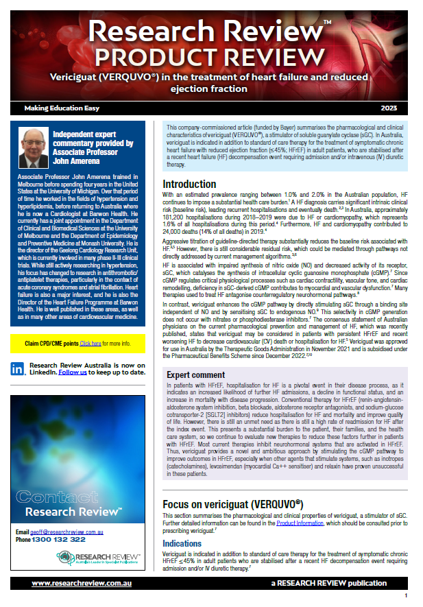 This review discusses pharmacological properties, mechanism of action, drug interactions and major studies featuring Vericiguat. It also provides commentary and recommendations from Associate Professor John Amerena, Cardiologist at Barwon Health and Director of the Geelong Cardiology Research Unit.