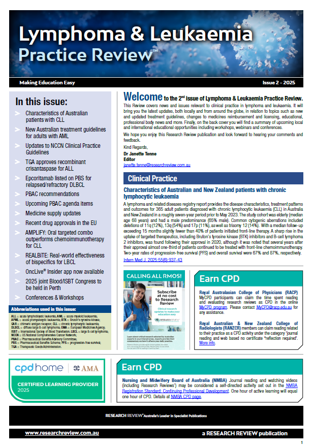 This Review features features key medical articles from global blood journals with commentary from Dr Pietro Di Ciaccio, Clinical A/Prof Anna Johnston and Drs Monique Menzies Wojtowicz and Shafqat Inam.