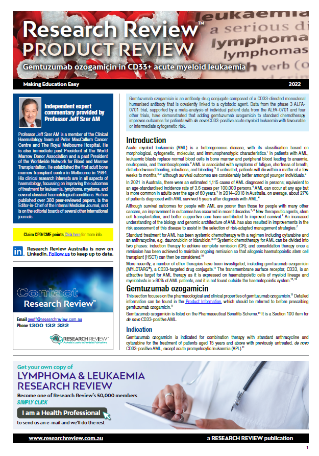 As part of our ongoing series focussing on available medicines in Australia, we have added a product review of gemtuzumab ozogamicin in CD33+ acute myeloid leukaemia.