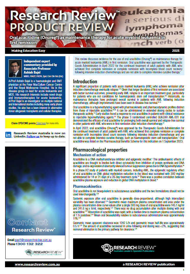As part of our series focussing on available medicines in Australia, we have added a product review of use of oral azacitidine as maintenance therapy for acute myeloid leukaemia in first remission.