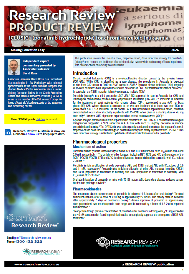 As part of our series focussing on available medicines in Australia, we have added a product review of the use of ponatinib hydrochloride for chronic myeloid leukaemia.