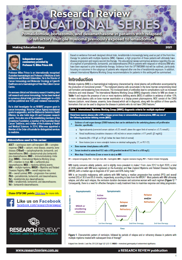The review includes guiding commentary from Professor Miles Prince, Professor of Medicine at Melbourne and Monash Universities and Director of Cancer Immunology and Molecular Oncology at Epworth Healthcare.