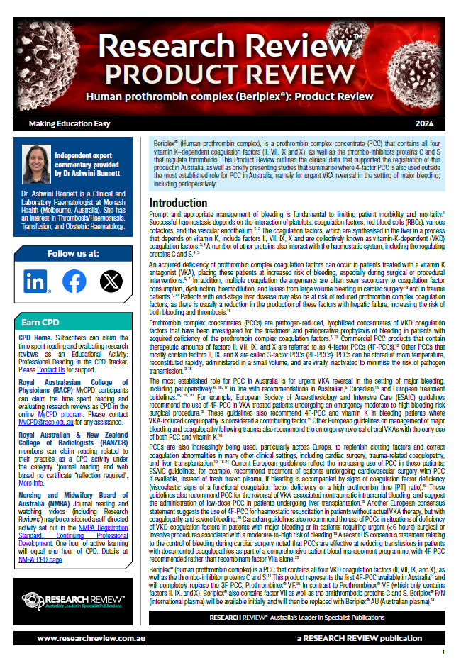 This review discusses clinical data that supported the product registration in Australia, and studies that summarise where 4-factor PCC is also used for urgent VKA reversal in the setting of major bleeding. It provides commentary from Dr Ashwini Bennett, a Clinical and Laboratory Haematologist at Monash Health.