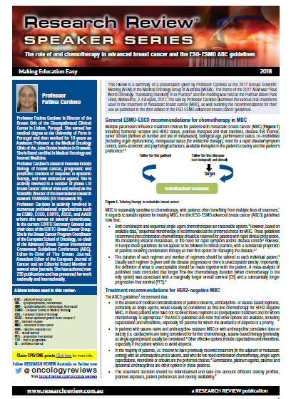 This review is a summary of a recent event in Melbourne at the MOGA annual scientific meeting. Professor Fatima Cardoso presented on the role of oral chemotherapy in advanced breast cancer and the ESO-ESMO ABC guidelines.