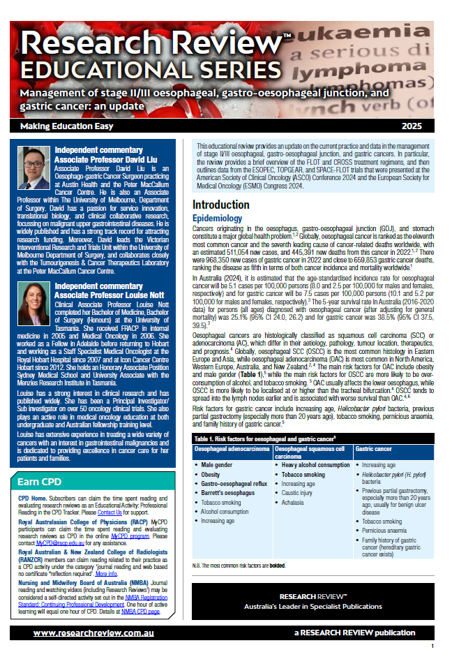 The review provides an overview of the FLOT and CROSS treatment regimens, and outlines data from the ESOPEC, TOPGEAR, and SPACE-FLOT trials that were presented at ASCO. It also includes guiding commentary from Associate Professor David Liu and Associate Professor Louise Nott.
