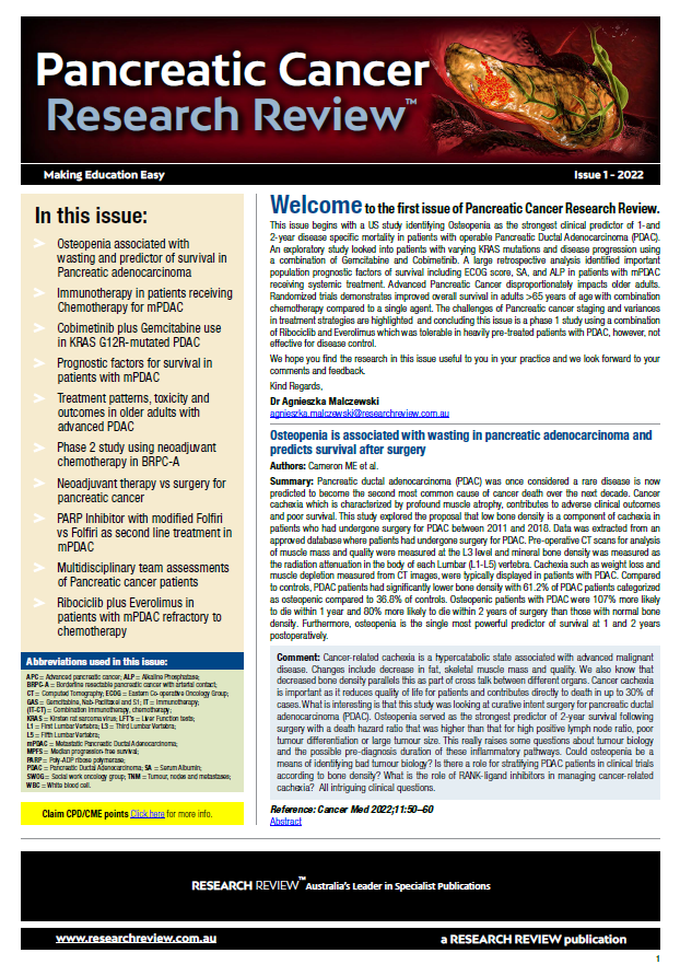 Drs Allan Zimet and Agnieszka Malczewski. The Review covers topics such as resectable pancreatic cancer, pancreatic ductal adenocarcinoma, osteopenia, immunotherapy, and news on advancing treatments.