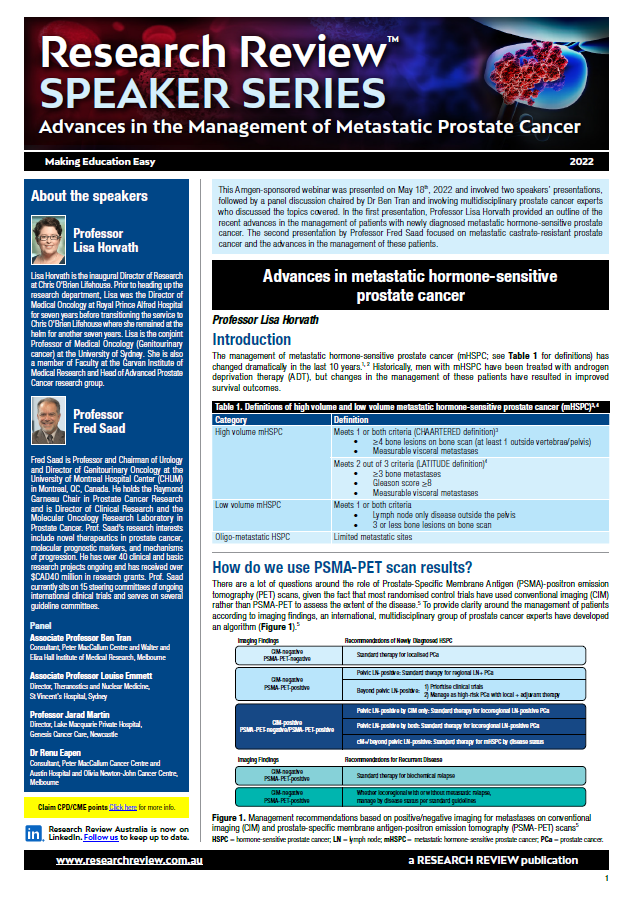 The presentation was given by Professor Lisa Horvath, Director of Research at Chris O’Brien Lifehouse, and Professor Fred Saad, Professor of Urology and Director of Genitourinary Oncology at the University of Montreal Hospital Center in Montreal, Canada.