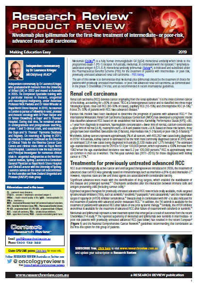 As part of our ongoing series focussing on new registrations in Australia, we have added a product review of the use of Cabozantinib in the first-line treatment of patients with advanced clear-cell renal cell carcinoma.