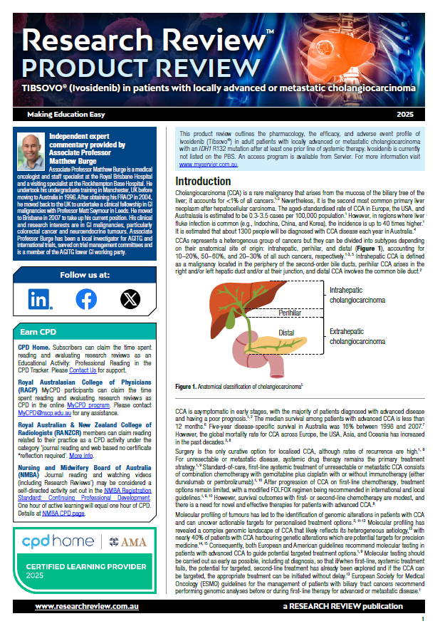 As part of our series focussing on medicines available in Australia, we have added a product review which outlines the pharmacology, efficacy, and adverse event profile of ivosidenib in adult patients with locally advanced or metastatic cholangiocarcinoma with an IDH1 R132 mutation after at least one prior line of systemic therapy.
