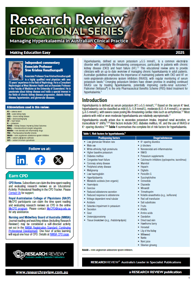 We're delighted to add our latest Educational Series titled: Managing hyperkalaemia in Australian clinical practice. Hyperkalaemia, defined as serum potassium ≥5.5 mmol/L, is a common electrolyte disorder with potentially life-threatening consequences, particularly in patients with chronic kidney disease and heart failure.