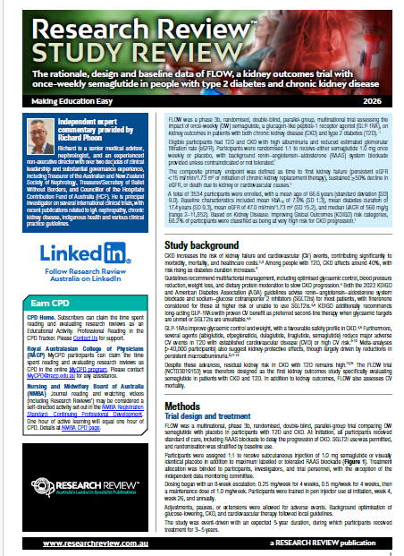 This is a study review on FLOW, a trial assessing the impact of once-weekly semaglutide on kidney outcomes in patients with both chronic kidney disease and type 2 diabetes.