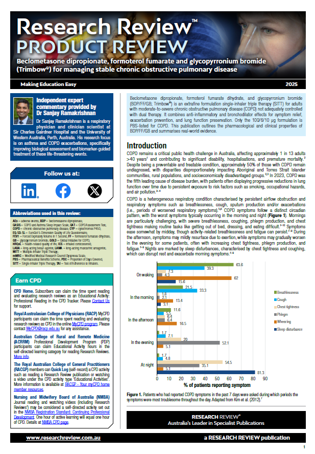 As part of our series focussing on medicines available in Australia, we have added a product review on beclometasone dipropionate, formoterol fumarate dihydrate, and glycopyrronium bromide (BDP/FF/GB) an extrafine formulation single-inhaler triple therapy for adults with moderate-to-severe chronic obstructive pulmonary disease not adequately controlled with dual therapy. This publication outlines the pharmacological and clinical properties of BDP/FF/GB and summarises real-world evidence.