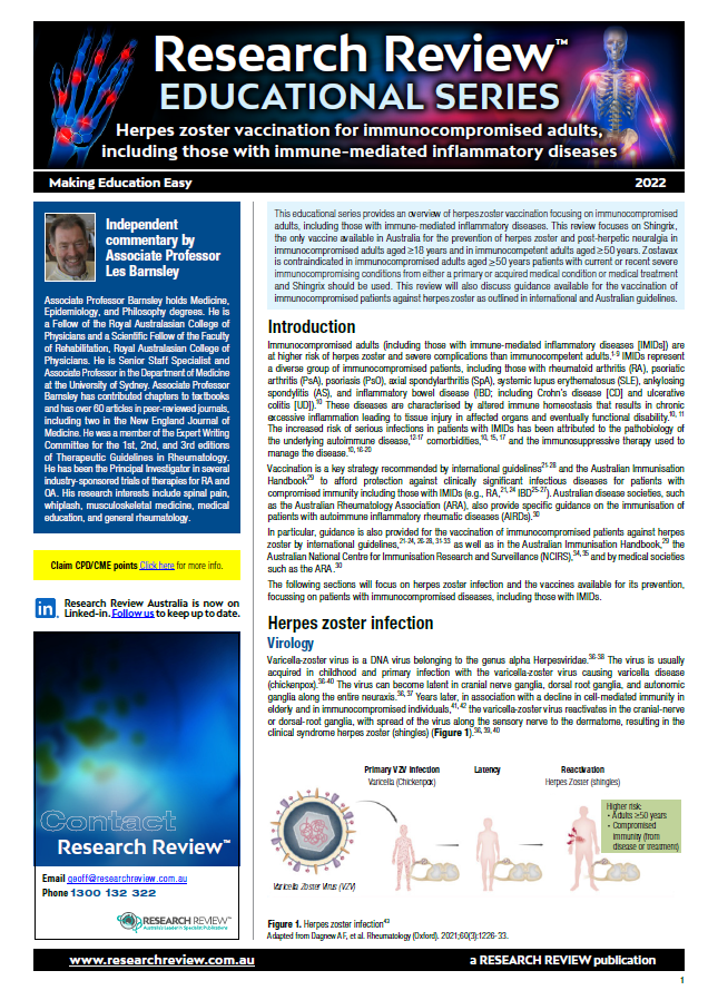 We are delighted to add our latest Educational Series titled: Herpes zoster vaccination for immunocompromised adults, including those with immune-mediated inflammatory diseases. This review focuses on guidance available for the vaccination of immunocompromised patients outlined in international and Australian guidelines.
