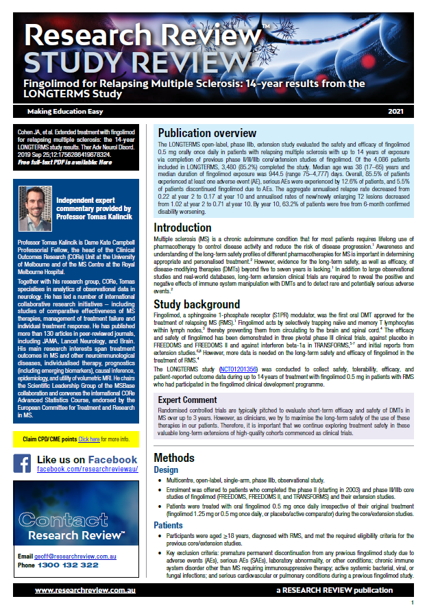 Independent expert commentary is provided by Professor Tomas Kalincik, the Dame Kate Campbell Professorial Fellow, the head of the Clinical Outcomes Research (CORe) Unit at the University of Melbourne and of the MS Centre at the Royal Melbourne Hospital.
