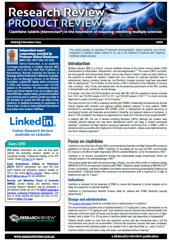 Guiding commentary has been provided by Professor Helmut Butzkueven, an academic neurologist specialising in multiple sclerosis research. He is the Van Cleef Roet Professor of Neuroscience, Monash University and Director of Neurology at Alfred Health (both in Melbourne, Australia). He is also the Managing Director of the MSBase Foundation, a global MS registry which commenced in 2004, and monitors outcomes in over 125,000 patients in 46 countries.
