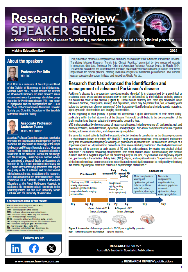 This is a summary of a recent webinar presented by two renowned experts in movement disorders, Professor Per Odin and Associate Professor Andrew Evans. It covers the latest research trends in advanced Parkinson's disease and their direct implications for clinical practice, offering invaluable insights for healthcare professionals.