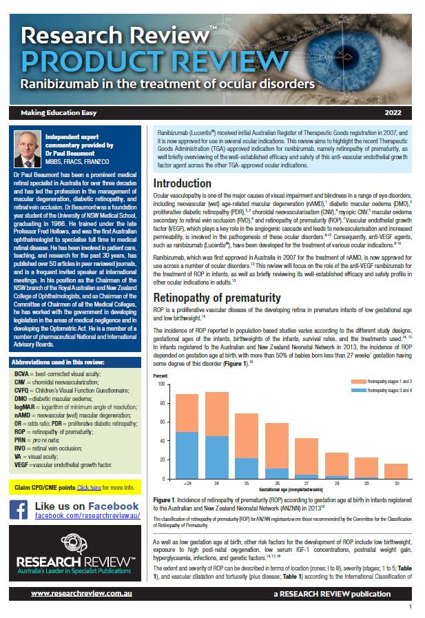 As part of our ongoing series focussing on new registrations in Australia, we have added a product review of the use of ranibizumab in the treatment of ocular disorders.