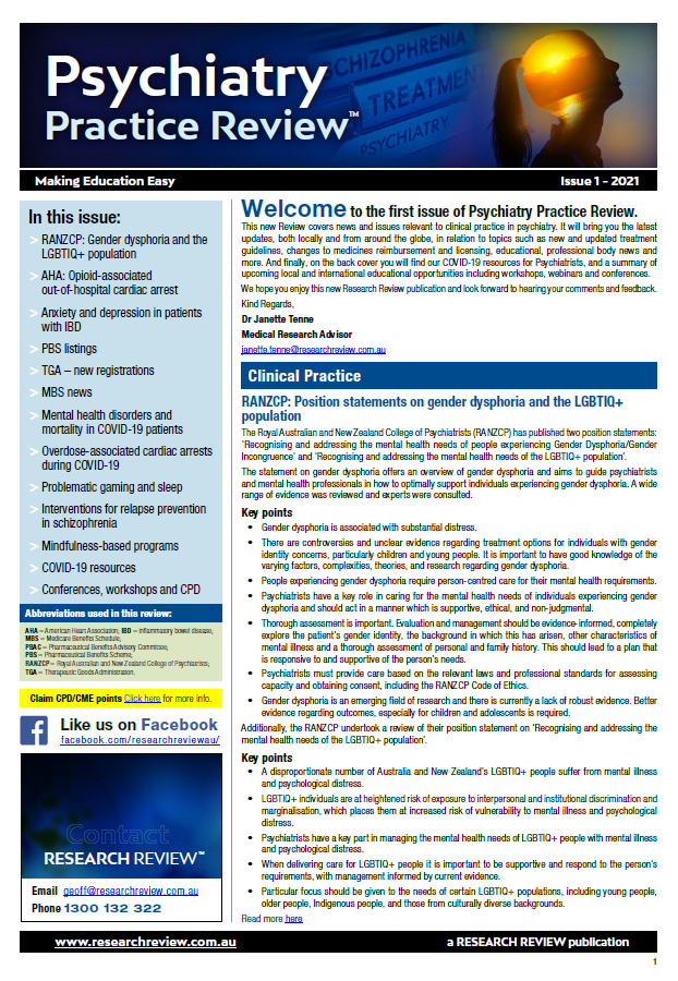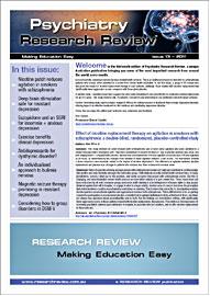 This Review features key medical articles from global psychiatry journals with commentary from Professors Nicholas Alexander Keks and Stephen TouyzThe Review covers topics such as neuropsychiatry, schizophrenia, antipsychotics depression, ADHD and SSRI's.