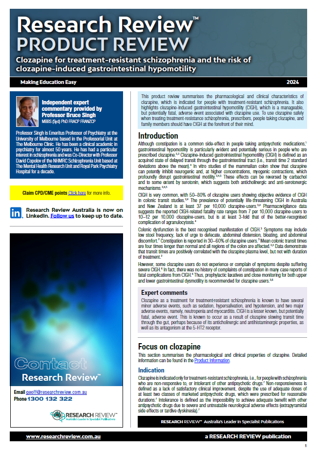 This publication focuses on the pharmacological and clinical characteristics of clozapine for people with treatment-resistant schizophrenia and highlights clozapine-induced gastrointestinal hypomotility. It provides commentary from Professor Bruce Singh, Emeritus Professor of Psychiatry at the University of Melbourne.