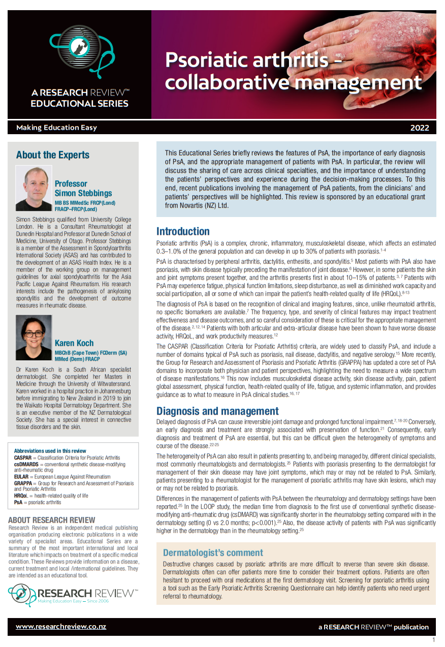 This Educational Series briefly reviews the features of PsA, the importance of early diagnosis of PsA, and the appropriate management of patients with PsA. In particular, the review will discuss the sharing of care across clinical specialties, and the importance of understanding the patients’ perspectives and experience during the decision-making processes. To this end, recent publications involving the management of PsA patients, from the clinicians’ and patients’ perspectives will be highlighted. This review is sponsored by an educational grant from Novartis (NZ) Ltd.
