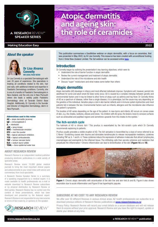 This publication summarises a Goodfellow webinar on atopic dermatitis, with a focus on ceramides, that was presented in May 2022, by Dr Lisa Connelly. This resource has been created with unconditional funding from L’Oréal New Zealand Limited. The full webinar can be accessed online here.