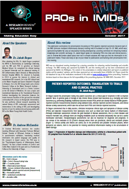 This publication summarises the presentations focussing on PROs (patient-reported outcomes) that were part of the IMID (immune-mediated inflammatory disease) meeting held in Auckland on Sept 29–30. IMID, which was sponsored by AbbVie NZ, was an educational meeting developed by a steering committee for enhancing medical knowledge and scientific exchange. Dr. Jakob Begun spoke on translating PROs into trials and clinical practice, and Dr. Andrew McCombie talked about their role in eHealth solutions. We hope you find the information in the publication helpful.
