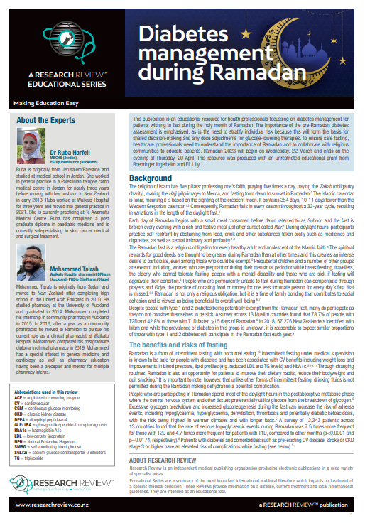 This publication is an educational resource for health professionals focussing on diabetes management for patients wishing to fast during the holy month of Ramadan. The importance of the pre-Ramadan diabetes assessment is emphasised, as is the need to stratify individual risk because this will form the basis for shared decision-making and any dose adjustments for glucose-lowering therapies. To ensure safe fasting, healthcare professionals need to understand the importance of Ramadan and to collaborate with religious communities to educate patients. Ramadan 2023 will begin on Wednesday, 22 March and ends on the evening of Thursday, 20 April. This resource was produced with an unrestricted educational grant from Boehringer Ingelheim and Eli Lilly.