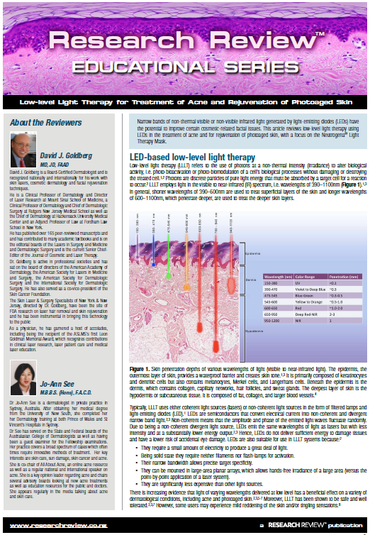 Narrow bands of non-thermal visible or non-visible infrared light generated by light-emitting diodes (LEDs) have the potential to improve certain cosmetic-related facial issues. This article reviews low-level light therapy using LEDs in the treatment of acne and for rejuvenation of photoaged skin, with a focus on the Neutrogena® Light Therapy Mask.