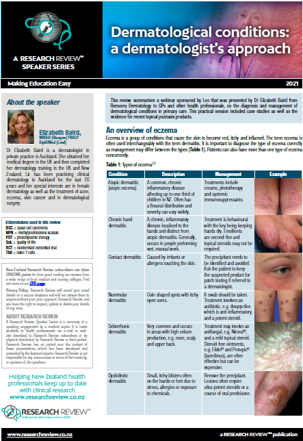 This review summarises a webinar sponsored by Leo that was presented by Dr Elizabeth Baird from Remuera Dermatology to GPs and other health professionals, on the diagnosis and management of dermatological conditions in primary care. This practical session included case studies as well as the evidence for recent topical psoriasis products.