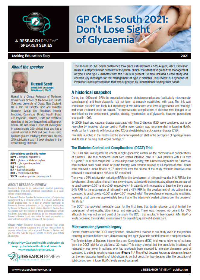 The annual GP CME South conference took place virtually from 27-29 August, 2021. Professor Russell Scott provided an overview of the pivotal clinical trials that have guided the management of type 1 and type 2 diabetes from the 1980s to present. He also included a case study and covered key messages for the management of type 2 diabetes. This review is a synopsis of Professor Scott’s presentation that was supported by unconditional funding from Sanofi.
