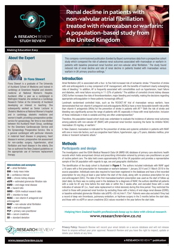 This company-commissioned publication (funded by Bayer) summarises data from a prospective cohort study which compared the risk of adverse renal outcomes associated with rivaroxaban or warfarin in patients with baseline preserved renal function and non-valvular atrial fibrillation. The study found reduced risk of renal decline and rate of renal decline in patients treated with rivaroxaban versus warfarin in UK primary practice settings.