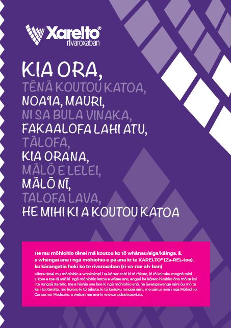 He rau mōhiohio tēnei mā koutou ko tō whānau/aiga/kâinga, ā, e whāngai ana i ngā mōhiohio e pā ana ki te XARELTO® (Za•REL•toe), ko kārangatia hoki ko te rivaroxaban (ri-va-rox-ah-ban).