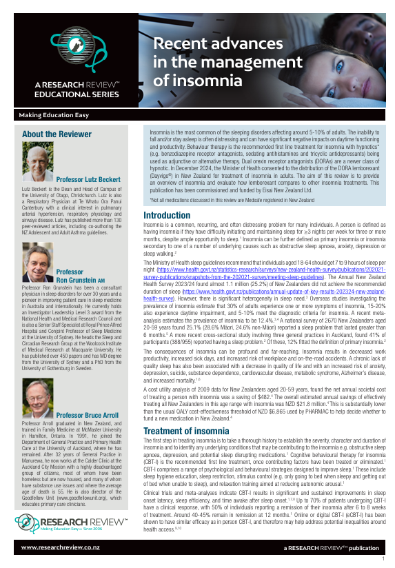 Insomnia is the most common of the sleeping disorders affecting around 5-10% of adults. The inability to fall and/or stay asleep is often distressing and can have significant negative impacts on daytime functioning and productivity. Behaviour therapy is the recommended first line treatment for insomnia with hypnotics* (e.g. benzodiazepine receptor antagonists, sedating antihistamines and tricyclic antidepressants) being used as adjunctive or alternative therapy. Dual orexin receptor antagonists (DORAs) are a newer class of hypnotic. In December 2024, the Minister of Health consented to the distribution of the DORA lemborexant (Dayvigo®) in New Zealand for treatment of insomnia in adults. The aim of this review is to provide an overview of insomnia and evaluate how lemborexant compares to other insomnia treatments. This publication has been commissioned and funded by Eisai New Zealand Ltd.