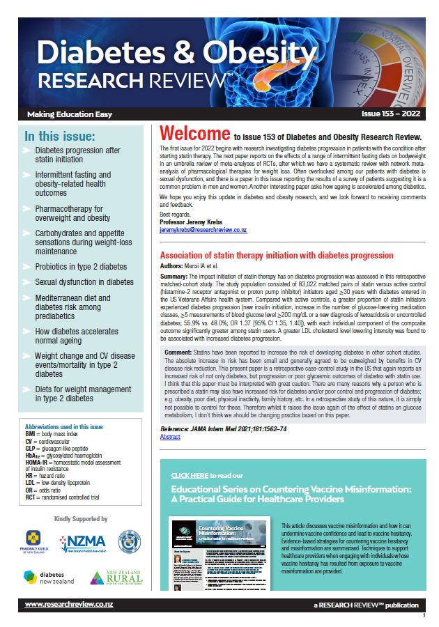 This Review features key medical articles from global diabetes and obesity journals with commentary from Professor Jeremy Krebs. The Review covers topics such as insulin & metformin use, type 2 diabetes, gestational diabetes, type 1 diabetes, bariatric surgery, diabetic retinopathy, thiazolidinediones and sulphonylureas.
