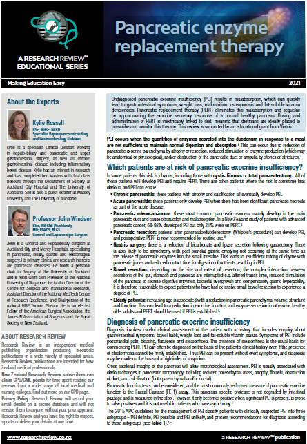 Undiagnosed pancreatic exocrine insufficiency (PEI) results in malabsorption, which can quickly lead to gastrointestinal symptoms, weight loss, malnutrition, osteoporosis and fat-soluble vitamin deficiencies. Pancreatic replacement therapy (PERT) eliminates this malabsorption and sequelae by approximating the exocrine secretory response of a normal healthy pancreas. Dosing and administration of PERT is inextricably linked to diet, meaning that dietitians are ideally placed to prescribe and monitor this therapy. This review is supported by an educational grant from Viatris.