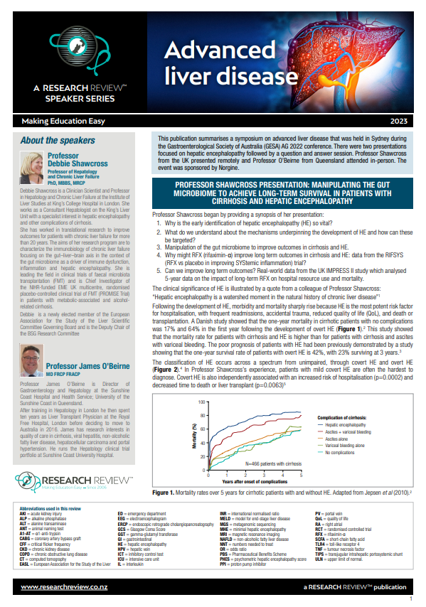 This publication summarises a symposium on advanced liver disease that was held in Sydney during the Gastroenterological Society of Australia (GESA) AG 2022 conference. There were two presentations focused on hepatic encephalopathy followed by a question and answer session. Professor Shawcross from the UK presented remotely and Professor O’Beirne from Queensland attended in-person. The event was sponsored by Norgine.