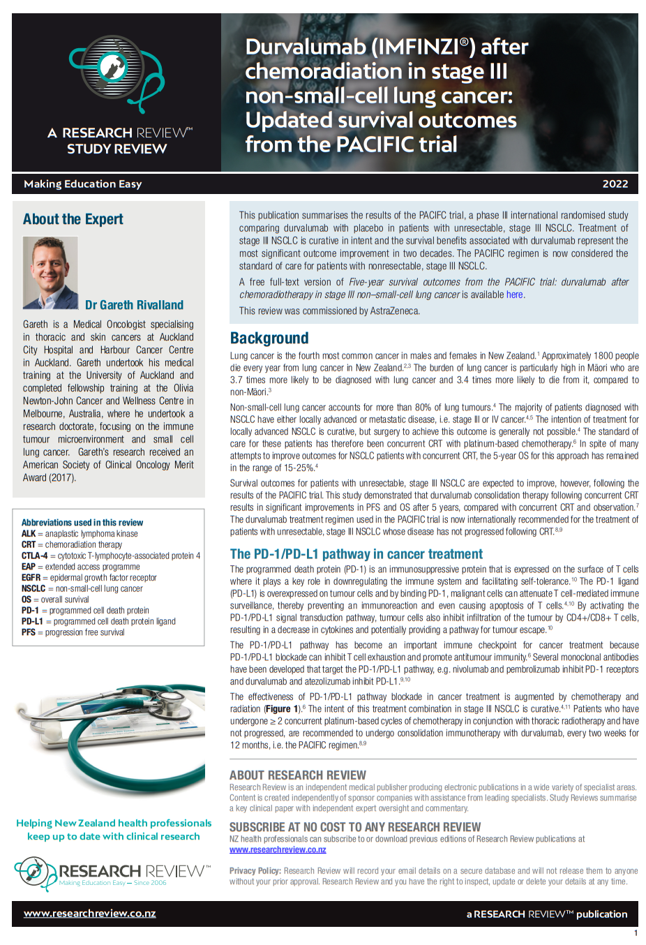 This publication summarises the results of the PACIFIC trial, a phase III international randomised study comparing durvalumab with placebo in patients with unresectable, stage III NSCLC. Treatment of stage III NSCLC is curative in intent and the survival benefits associated with durvalumab represent the most significant outcome improvement in two decades. The PACIFIC regimen is now considered the standard of care for patients with nonresectable, stage III NSCLC.