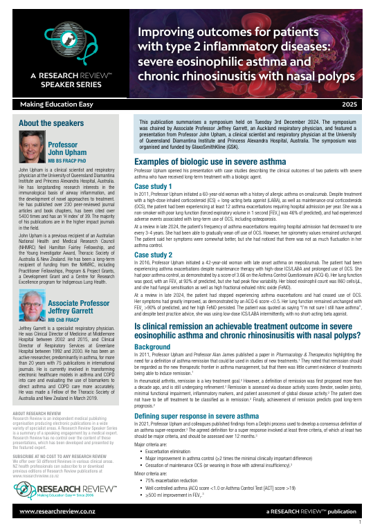 This publication summarises a symposium held on Tuesday 3rd December 2024. The symposium was chaired by Associate Professor Jeffrey Garrett, an Auckland respiratory physician, and featured a presentation from Professor John Upham, a clinical scientist and respiratory physician at the University of Queensland Diamantina Institute and Princess Alexandra Hospital, Australia.