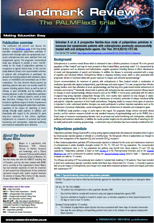 This publication will present and discuss the findings of the PALMFlexS study of the long-acting injectable antipsychotic paliperidone palmitate in patients with clinically stable but symptomatic (nonacute) schizophrenia who were switched from oral antipsychotic agents.